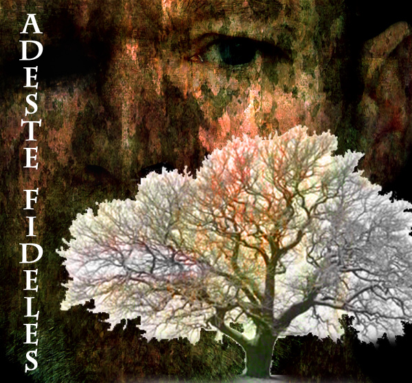 Grunge design. Udgangspunktet et selvportræt og et billede af et snedækket træ. Jeg har brugt masser af forskellige blendmodes og nogle betonstrukturer til at lave grunge effekter. Derudover har jeg brugt "clouds" fra Photoshop til at skabe farvevariationer henover billedfladen. Fonten hedder Charlemagne Std og "Adeste Fideles" betyder "Vær tilstede, Trofaste en" |