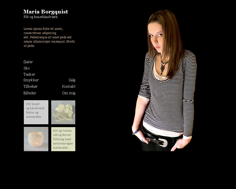Side for en fiktiv kunsthåndværker, der laver filt til en målgruppe af 20-30 årige kvinder. Målgruppen er både modebevidste og økologiske. Siden er holdt helt i sort, for at lade de sarte nuancer i filten træde frem Småbillederne i bunden skal skifte til relevante produkter, når musen føres over menupunkterne. |