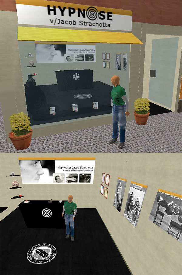 Opgave for hypnotisør Jacob Strachotta. Formålet var en butik, der kunne profilere Jacob. En del grafisk arbejde og meget Second Life Scripting (LSL) for at tilføje funtionalitet og interaktivitet. Dagbog over Second Life Udviklingsprojekt Besøg Butikken i Second Life |